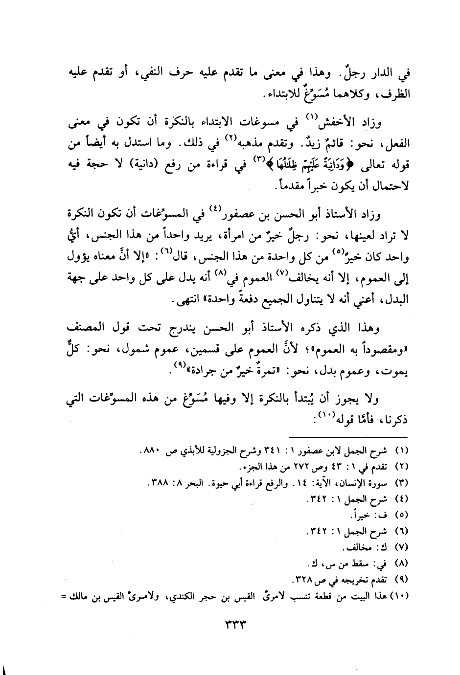 وزاد الأخفش في مسوغات الابتداء بالنكرة أن تكون في معني الفعل, نحو: قائم زيد. وتقدم مذهبه في ذلك. وما استدل به أيضا من قوله تعالي {وَدَانِيَةً عَلَيْهِمْ ظِلَالُهَا} في قراءة من رفع (دانية) لا حجة فيه لاحتمال أن يكون خبرا مقدما.