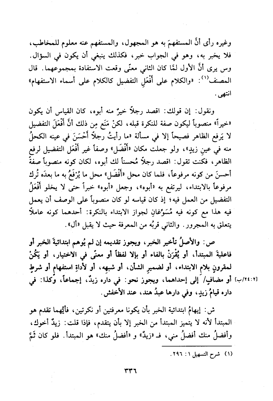 وغيره رأى أن المستفهم به هو المجهول, والمستفهم عنه معلوم للمخاطب, فلا يخبر به, وهو في الجواب خبر, فكذلك ينبغي أن يكون في السؤال. وس يري أن الأول لما كان الثاني معني وقعت الاستفادة بمجموعهما. قال المصنف: "والكلام علي أفعل التفضيل كالكلام علي أسماء الاستفهام" انتهي.