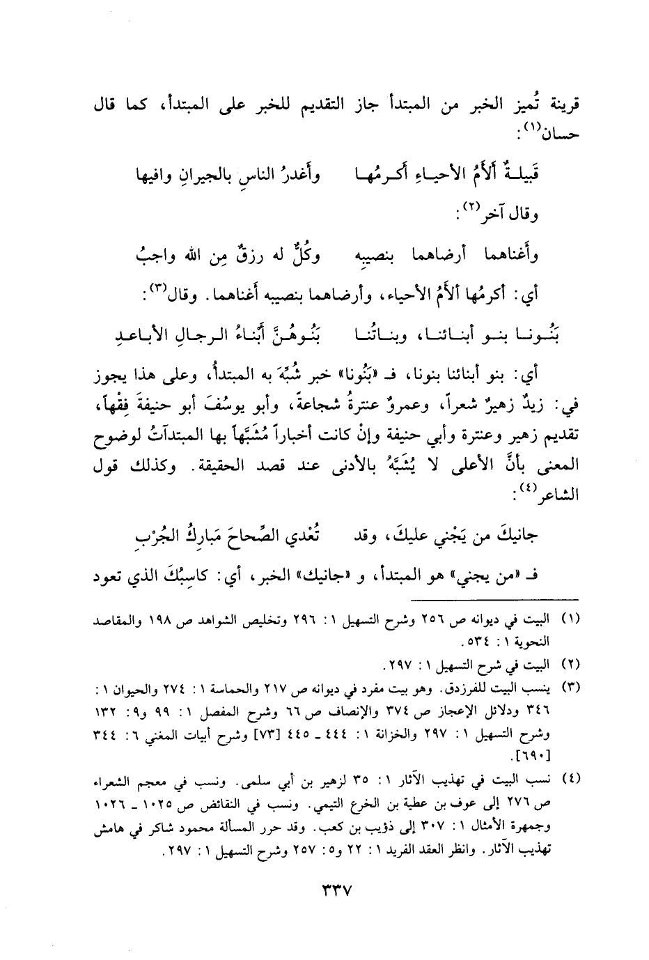 أي: بنو أبنائنا بنونا, فـ "بنونا" خبر شبه به المبتدأ, وعلي هذا يجوز في: زيد زهير شعرا, وعمرو عنترة شجاعة, وأبو يوسف أبو حنيفة فقها, تقديم زهير وعنترة وأبي حنيفة وإن كانت أخبارا مشبها بها المبتدآت لوضوح المعني بأن الأعلى لا يشبه بالأدنى عند قصد الحقيقة. وكذلك قول الشاعر: