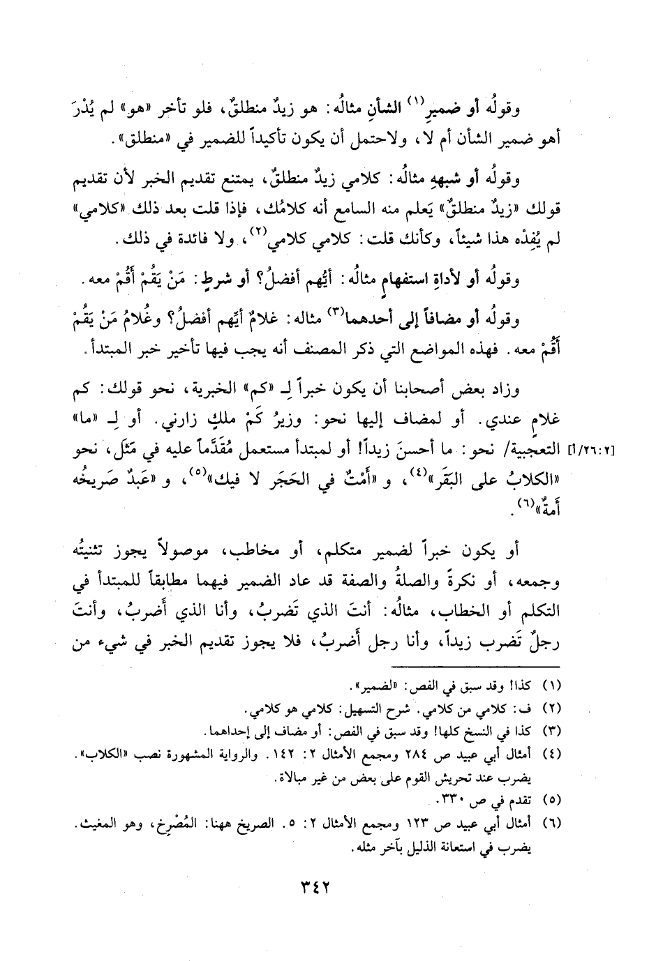 وقوله أو مضافاً إلى احدهما مثاله: غلام أيهم أفضل؟ وغلام من يقم أقم معه. فهذه المواضع التي ذكر المصنف أنه يجب فيها تأخير خبر المبتدأ.