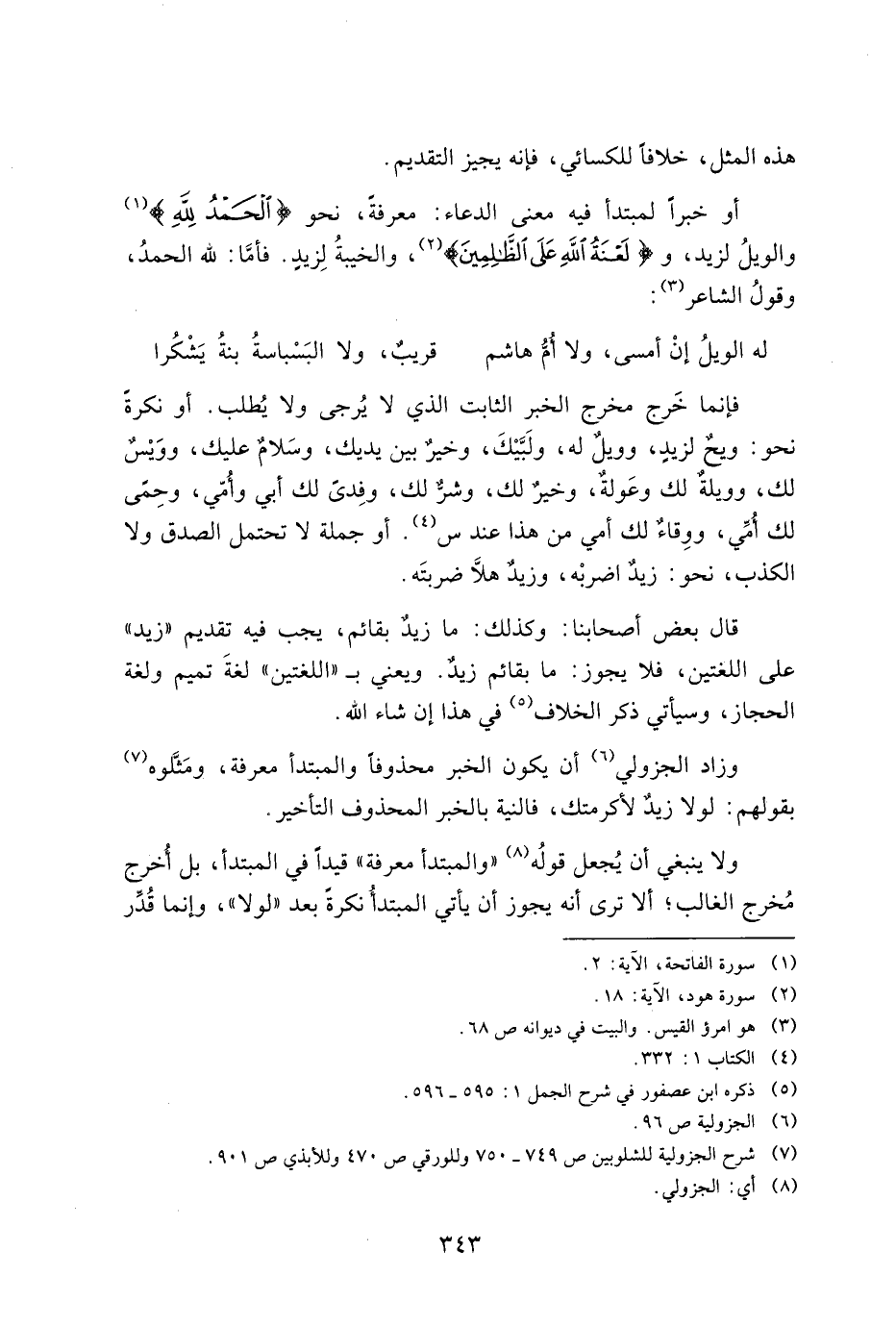 فإنما خرج مخرج الخبر الثابت الذي لا يرجى ولا يطلب. أو نكرة نحو: ويح لزيد وويل له ولبيك وخير بين يديك وسلام عليك وويس لك, وويله لك وعوله, وخير لك وشر لك وفدى لك أبي وأمي وحمى لك أمي ووفاء لك أمي من هذا عند س. أو جملة لا تحتمل الصدق لا الكذب نحو: زيد اضربه, وزيد هلا ضربته.