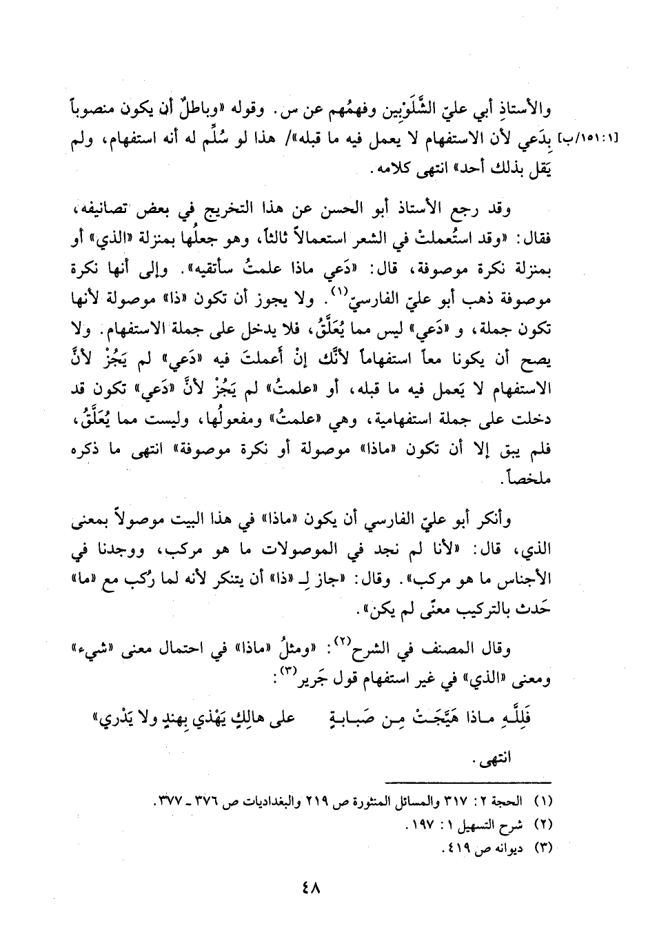 وأنكر أبو علي الفارسي أن يكون "ماذا" في هذا البيت موصولًا بمعنى الذي، قال: "لأنا لم نجد في الموصولات ما هو مركب، ووجدنا في الأجناس ما هو مركب" وقال: "جاز لـ "ذا" أن يتنكر لأنه لما ركب مع "ما" حدث بالتركيب معنى لم يكن".