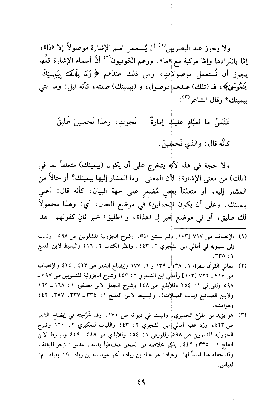ولا يجوز عند البصريين أن يستعمل اسم الإشارةً موصولا إلا "ذا"، إما بانفرادها وإما مركبةً مع "ما" وزعم الكوفيون أن أسماء الإشارةً كلها يجوز أن تستعمل موصولات، ومن ذلك عندهم {وَمَا تِلْكَ بِيَمِينِكَ يَا مُوسَى} فـ (تلك) عندهم موصول، و (بيمينك) صلته، كأنه قيل: وما التي بيمينك؟ وقال الشاعر:
