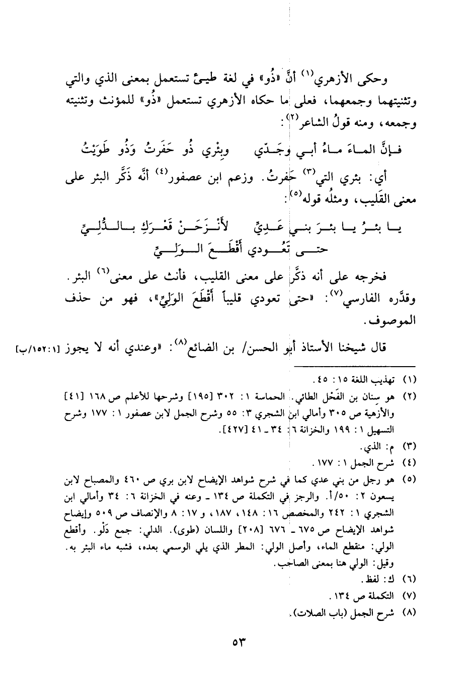 وحكى الأزهري أن "ذو" في لغة طيئ تستعمل بمعنى الذي والتي وتثنيتهما وجمعهما، فعلى أما حكاه الأزهري تستعمل "ذو" للمؤنث، وتثنيته وجمعه، ومنه قول الشاعر: