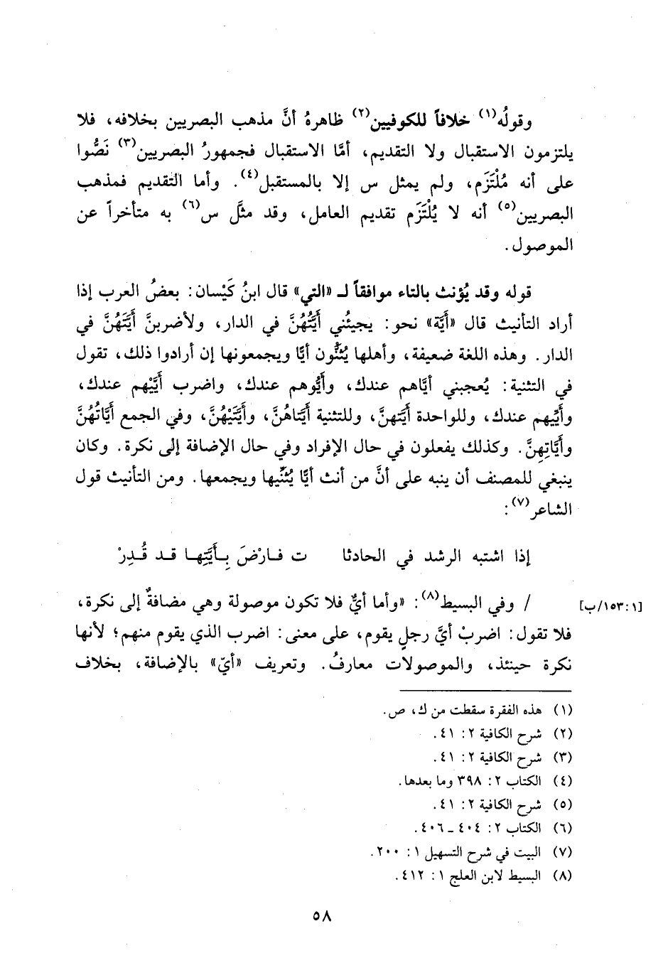 قوله وقد يؤنث بالتاء موافقًا لـ "التي" قال ابن كيسان: بعض العرب إذا أراد التأنيث قل "أية" نحو: يجيئني أيتهن في الدار, ولأضربن أيتهن في الدار. وهذه اللغة ضعيفةً، وأهلها يثنون أيا ويجمعونها إن أرادوا ذلك، تقول في التثنية: يعجبني أياهم عندك، وأيوهم عندك، واضرب أييهم عندك، وأيهم عندك، وللواحدةً أيتهن، وللتثنيةً أيناهن، وأيتيهن، وفي الجمع أياتُهن وأياتِهن. وكذلك يفعلون في حال الإفراد وفي حال الإضافةً إلى نكرة. وكان ينبغي للمصنف أن ينبه على أن من أنث أيا يثنيها ويجمعها. ومن التأنيث قول الشاعر: