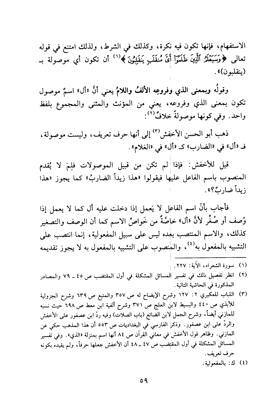 فأجاب بأن اسم الفاعل لا يعمل إذا دخلت عليه "أل" كما لا يعمل إذا وصف أو صغر لأن "أل" خاصة من خواص الاسم كما أن الوصف والتصغير كذلك، والاسم المنتصب بعده ليس على سبيل المفعوليةً، إنما انتصب على التشبيه بالمفعول به، والمنصوب على التشبيه بالمفعول به لا يجوز تقديمه