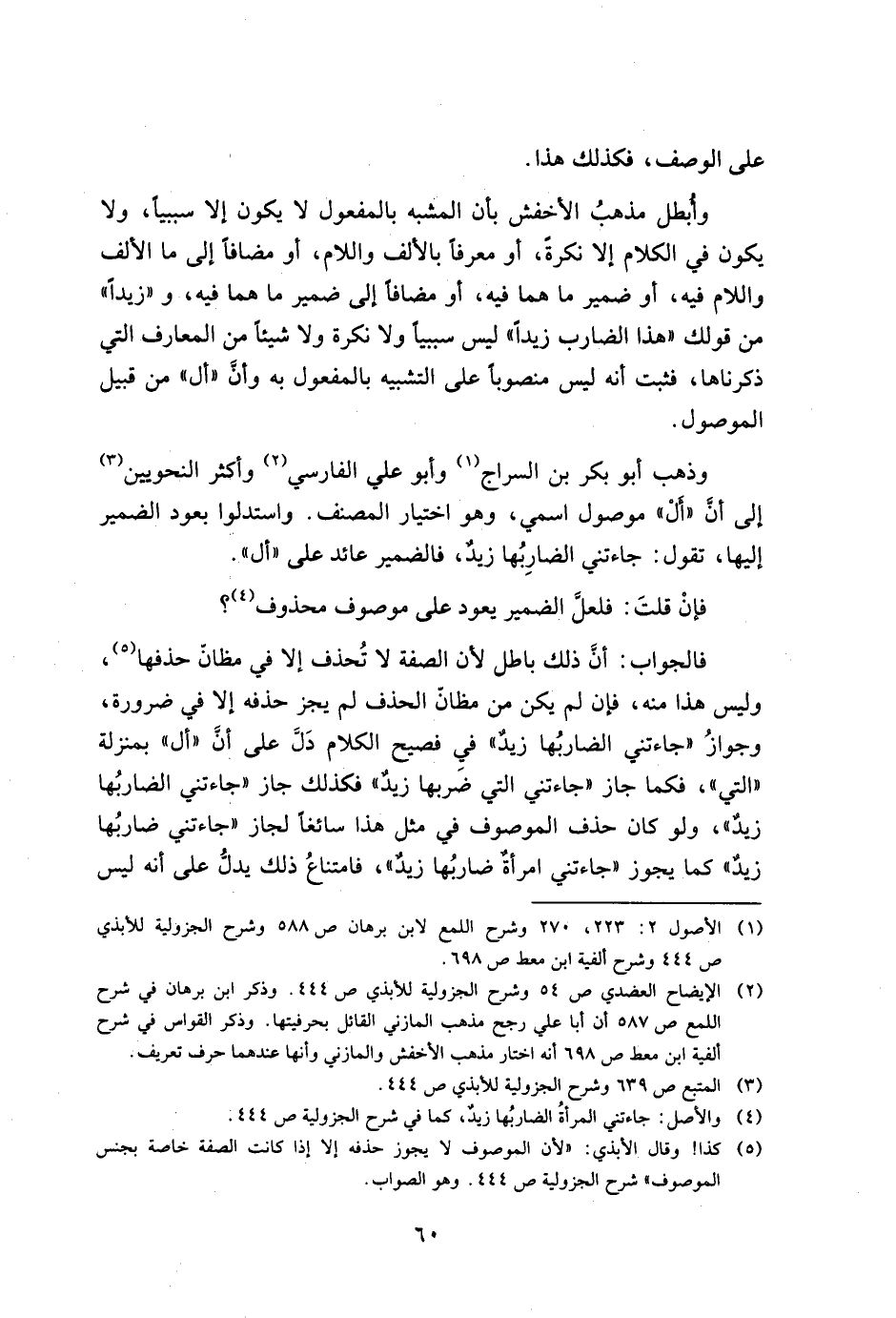 وأبطل مذهب الأخفش بأن المشبه بالمفعول، لا يكون إلا سببيًا، ولا يكون في الكلام إلا نكرةً، أو معرفًا بالألف واللام، أو مضافًا إلى ما الألف واللام فيه، أو ضمير ما هما فيه، أو مضافًا إلى ضمير ما هما فيه، و"زيد" من قولك "هذا الضارب زيدًا" ليس سببيًا ولا نكرةً ولا شيئًا من المعارف الني ذكرناها، فثبت أنه ليس منصوبًا على التشبيه بالمفعول به وأن "أل"، من قبيل الموصول.