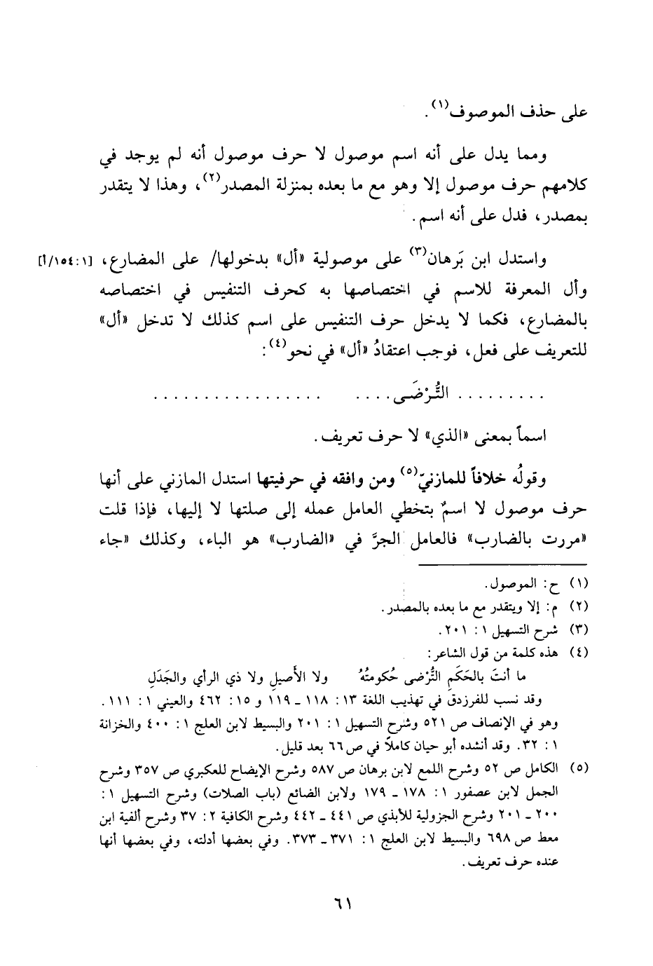 واستدل ابن برهان علي موصولية "أل" بدخولها / علي المضارع, وأل المعرفة للاسم في اختصاصها به كحرف التنفيس في اختصاصه بالمضارع, فكما لا يدخل حرف التنفيس علي اسم كذلك لا تدخل "أل" للتعريف علي فعل, فوجب اعتقاد "أل" في نحو: