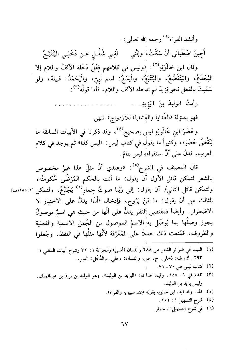 وحصر ابن خالويه ليس بصحيح, وقد ذكرنا في الأبيات السابقة ما ينقض حصره, وكثيرا ما يقول في كتاب ليس: "ليس كذا" ثم يوجد في كلام العرب, فدل علي أن استقراءه ليس بتام.
