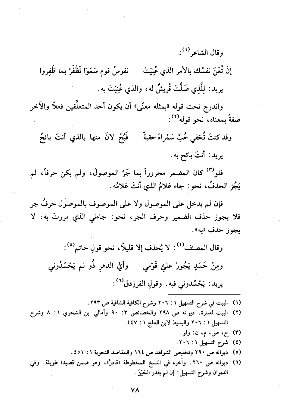 وقال المصنف: لا يحذف إلا قليلا, نحو قول حاتم: