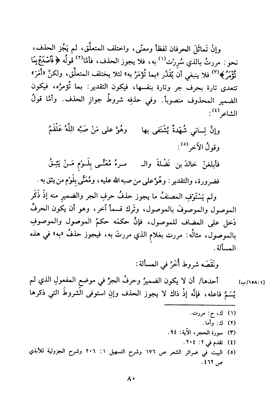 وإن تماثل الحرفان لفظا ومعني, واختلف المتعلق, لم يجز الحذف, نحو: مررت بالذي سررت به, فلا يجوز الحذف, فأما قوله {فَاصْدَعْ بِمَا تُؤْمَرُ} فلا ينبغي أن يقدر "بما تؤمر به" لئلا يختلف المتعلق, ولكن "أمر" تتعدي تارة بحرف جر وتارة بنفسها, فيكون التقدير: بما تؤمره, فيكون الضمير المحذوف منصوبا. وفي حذفه شروط جواز الحذف. وأما قول الشاعر: