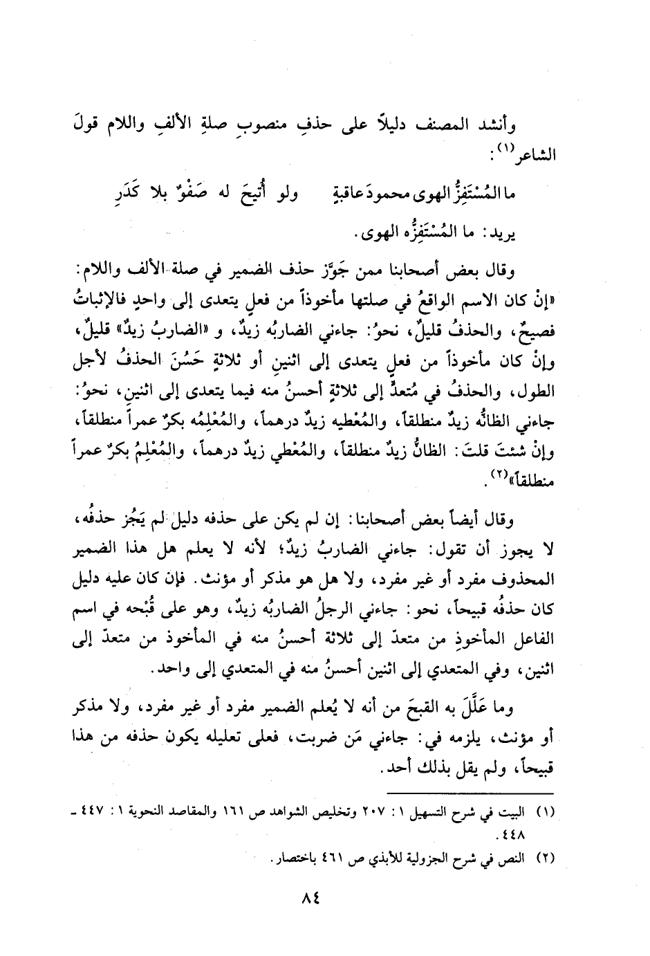 وقال أيضاً بعض أصحابنا: إن لم يكن على حذفه دليل لم يجز حذفه، لم يجز حذفه، لا يجوز أن تقول: جاءني الضارب زيد، لأنه لا يعلم هل هذا الضمير المحذوف مفرد أو غير مفرد، ولا هل هو مذكر أو مؤنث. فإن كان عليه دليل كان حذفه قبيحاً، نحو: جاءني الرجل الضاربه زيد، وهو على قبحه في اسم الفاعل المأخوذ من متعد إلى ثلاثة أحسن منه في المأخوذ من متعد إلى اثنين، وفي المتعدى إلى اثنين أحسن منه في المتعدى إلى واحد.
