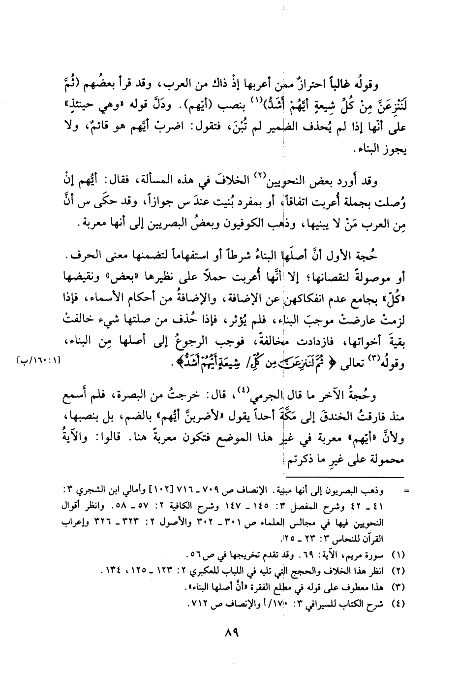 حُجة الأول أن أصلها البناء شرطاً أو استفهاماً لتضمنها معنى الحرف. أو موصولة لنقصانها، إلا أنها أعربت حملاً على نظيرها "بعض" ونقيضها "كل" بجامع عدم انفكاكهن عن الإضافة، والإضافة من أحكام الأسماء، فإذا لزمت عارضت موجب البناء، فلم يؤثر، فإذا حذف من صلتها شيء خالفت بقية أخواتها، فازدادت مخالفة، فوجب الرجوع إلى أصلها من البناء، وقوله تعالى {ثُمَّ لَنَنزِعَنَّ مِن كُلِّ شِيعَةٍ أَيُّهُمْ أَشَدُّ}.