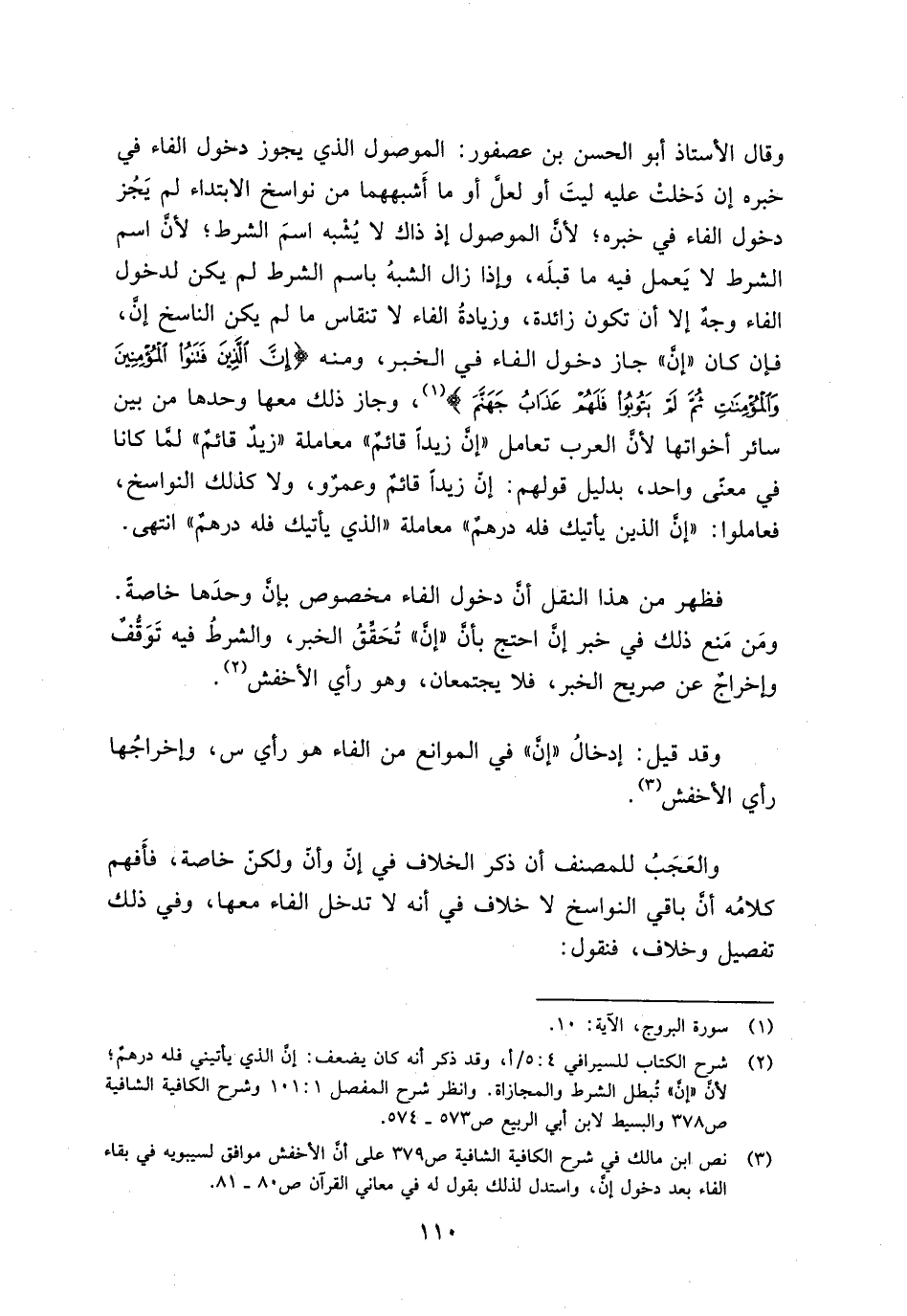 وقال الأستاذ أبو الحسن بن عصفور: الموصول الذي يجوز دخول الفاء في خبره إذا دخلت عليه ليت أو لعل أو ما أشبههما من نواسخ الابتداء لم يجز دخول الفاء في خبره؛ لأن الموصول إذ ذاك لا يشبه اسم الشرط؛ لأن اسم الشرط لا يعمل فيه ما قبله، وإذا زال الشبه باسم الشرط لم يكن لدخول الفاء وجه إلا أن تكون زائدة، وزيادة الفاء لا تنقاس ما لم يكن الناسخ إن، فإن كان "إن" جاز دخول الفاء في الخبر، ومنه {إِنَّ الَّذِينَ فَتَنُوا الْمُؤْمِنِينَ وَالْمُؤْمِنَاتِ ثُمَّ لَمْ يَتُوبُوا فَلَهُمْ عَذَابُ جَهَنَّمَ}، وجاز ذلك معها وحدها من بين سائر أخواتها لأن العرب تعامل "إن زيد قائم" معاملة "زيد قائم" لما كانا في معنى واحد، بدليل قولهم: إن زيدًا قائم وعمرو، ولا كذلك النواسخ، فعاملوا: "إن الذين يأتيك فله درهم" معاملة "الذين يأتيك فله ردهم" انتهى.