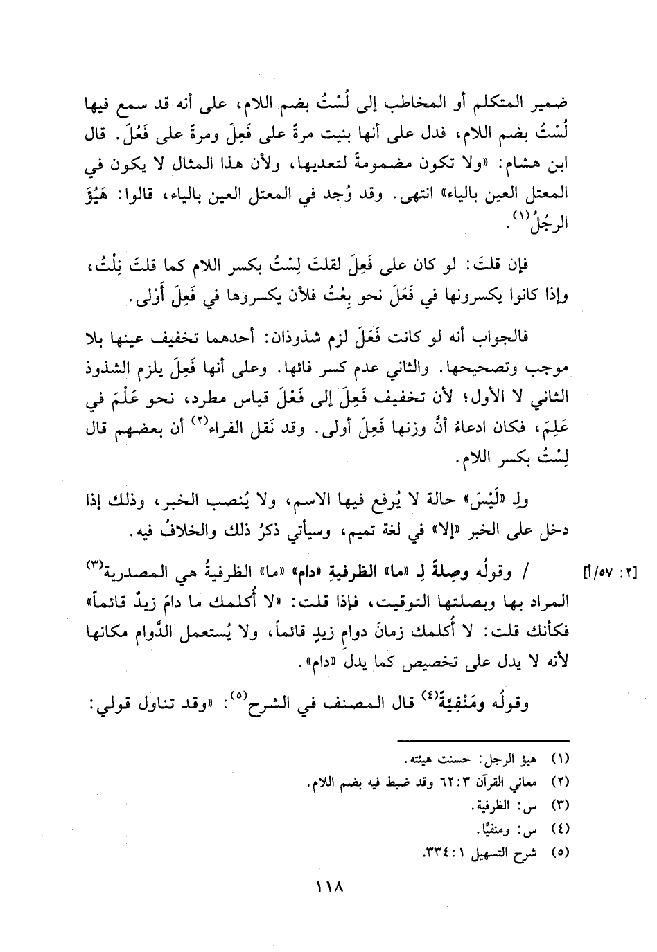 ضمير المتكلم أو المخاطب إلى لست بضم اللام، على أنه قد سمع فيها لست بضم اللام، فدل على أنها بنيت مرة على فعل ومرة على فعل. قال ابن هشام: "ولا تكون مضمومة لتعديها، ولأن هذا المثال لا يكون في المعتل العين بالياء" انتهى. وقد وجد في المعتل العين بالياء، قالوا: هيؤ الرجل.