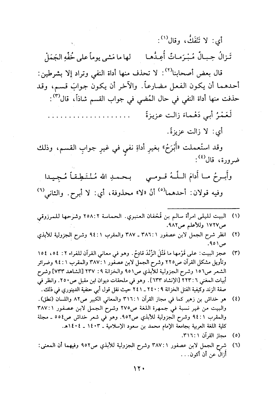 قال بعض أصحابنا: لا تحذف منها أداة النفي وتراد إلا بشرطين: أحدهما أن يكون الفعل مضارعًا. والآخر أن يكون جواب قسم، وقد حذفت منها أداة النفي في حال المضي في جواب القسم شاذًا، قال: