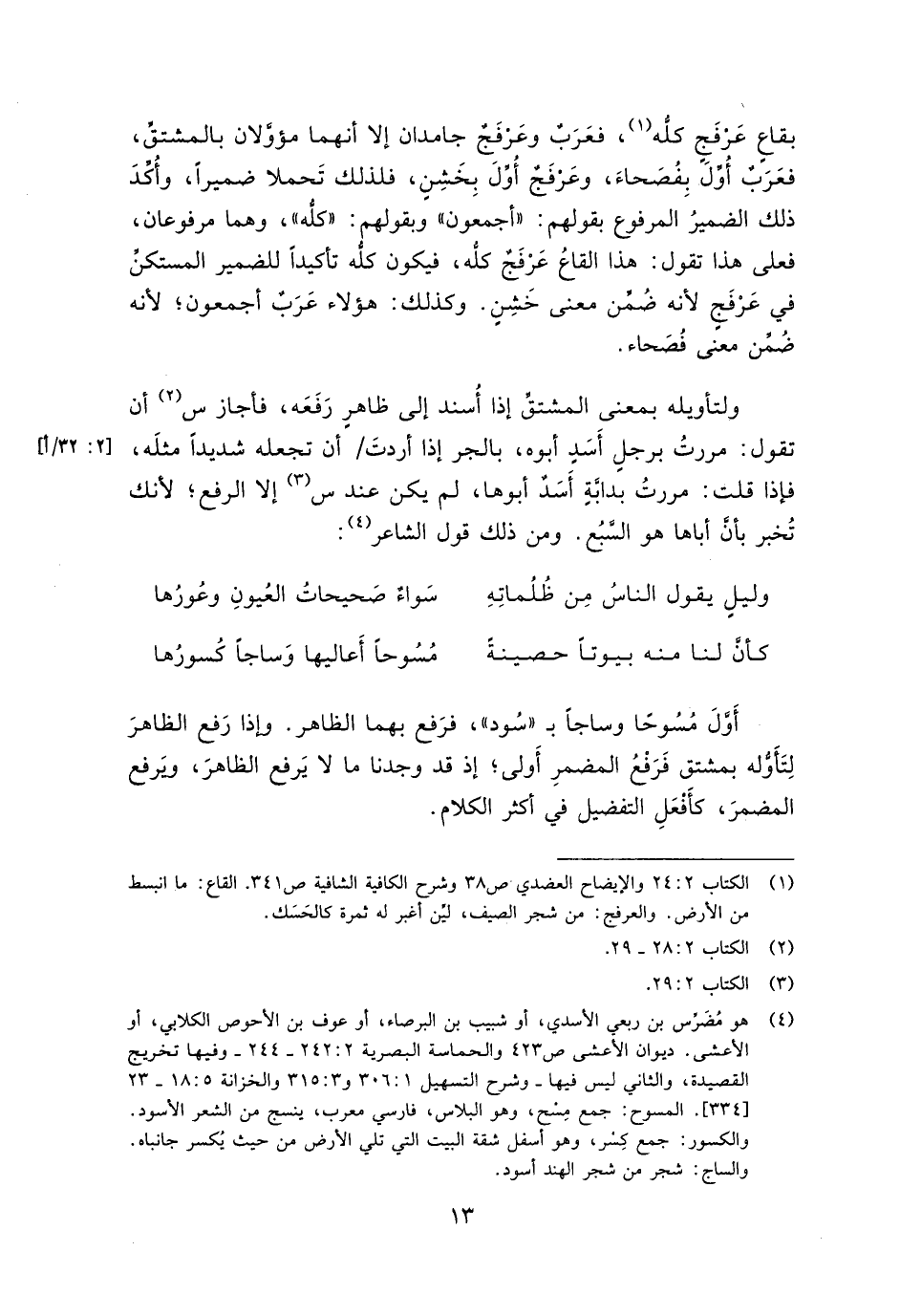 بقاع عرفج كله، فعرب وعرفج جامدان إلا أنهما مؤولان بالمشتق، فعرب أول بفصحاء، وعرفج أول بخشن، فلذلك تحملا ضميرًا، وأكد ذلك الضمير المرفوع بقولهم: "أجمعون" وبقولهم "كله"، وهما مرفوعان، فعلى هذا تقول: هذا القاع عرفج كله، فيكون كله تأكيدًا للضمير المستكن في عرفج لأنه ضمن معنى خشن. وكذلك: هؤلاء عرب أجمعون؛ لأنه ضمن معنى فصحاء.