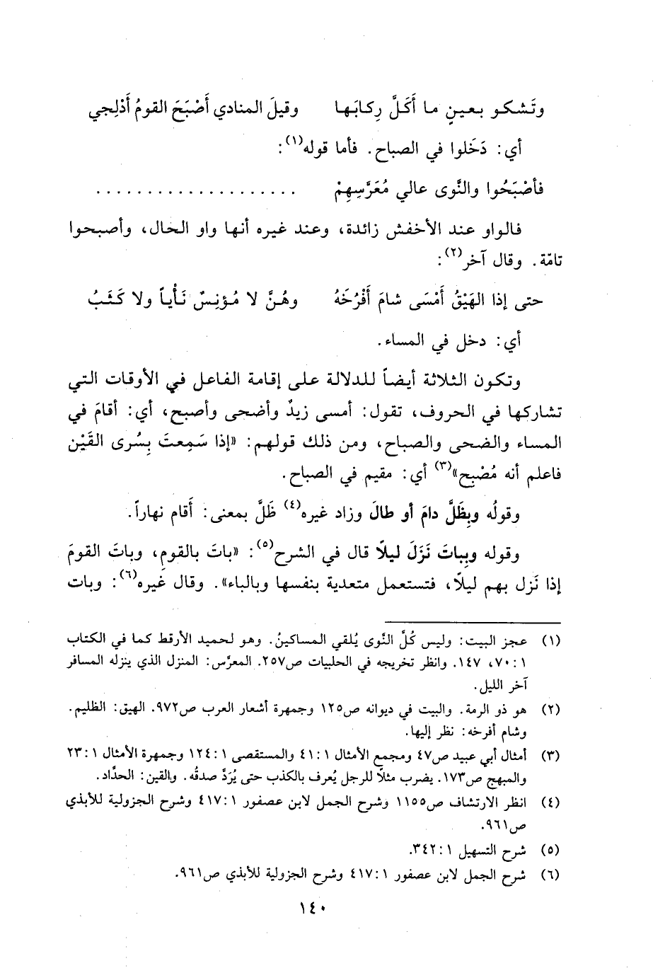 وتكون الثلاثة أيضًا للدلالة على إقامة الفاعل في الأوقات التي تشاركها في الحروف، تقول: أمسى زيد وأضحى وأصبح، أي: أقام في المساء والضحى والصباح، ومن ذلك قولهم: "إذا سمعت بسرى القين فاعلم أنه مصبح" أي: مقيم في الصباح.