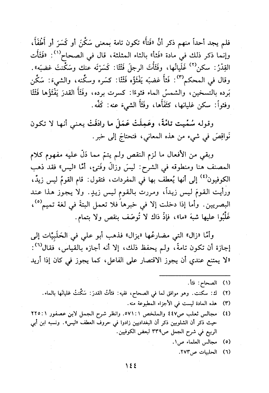 فلم يجد أحدًا منهم ذكر أن "فتأ" تكون تامة بمعنى سكن أو كسر أو أطفأ، وإنما ذكر ذلك في مادة "فثأ" بالثاء المثلثة، قال في الصحاح: "فثأت القدر: سكن غليانها، وفثأت الرجل فثئًا: كسرته عنه وسكنت غضبه". وقال في المحكم: فثأ غضبه يفثؤه فثئًا: كسره وسكنه، والشيء: سكن برده بالتسخين، والشمس الماء فثوءًا: كسرت برده، وفثأ القدر يفثؤها فثئًا وفثوًا: سكن غليانها، كثفأها، وفثأ الشيء عنه: كفه.
