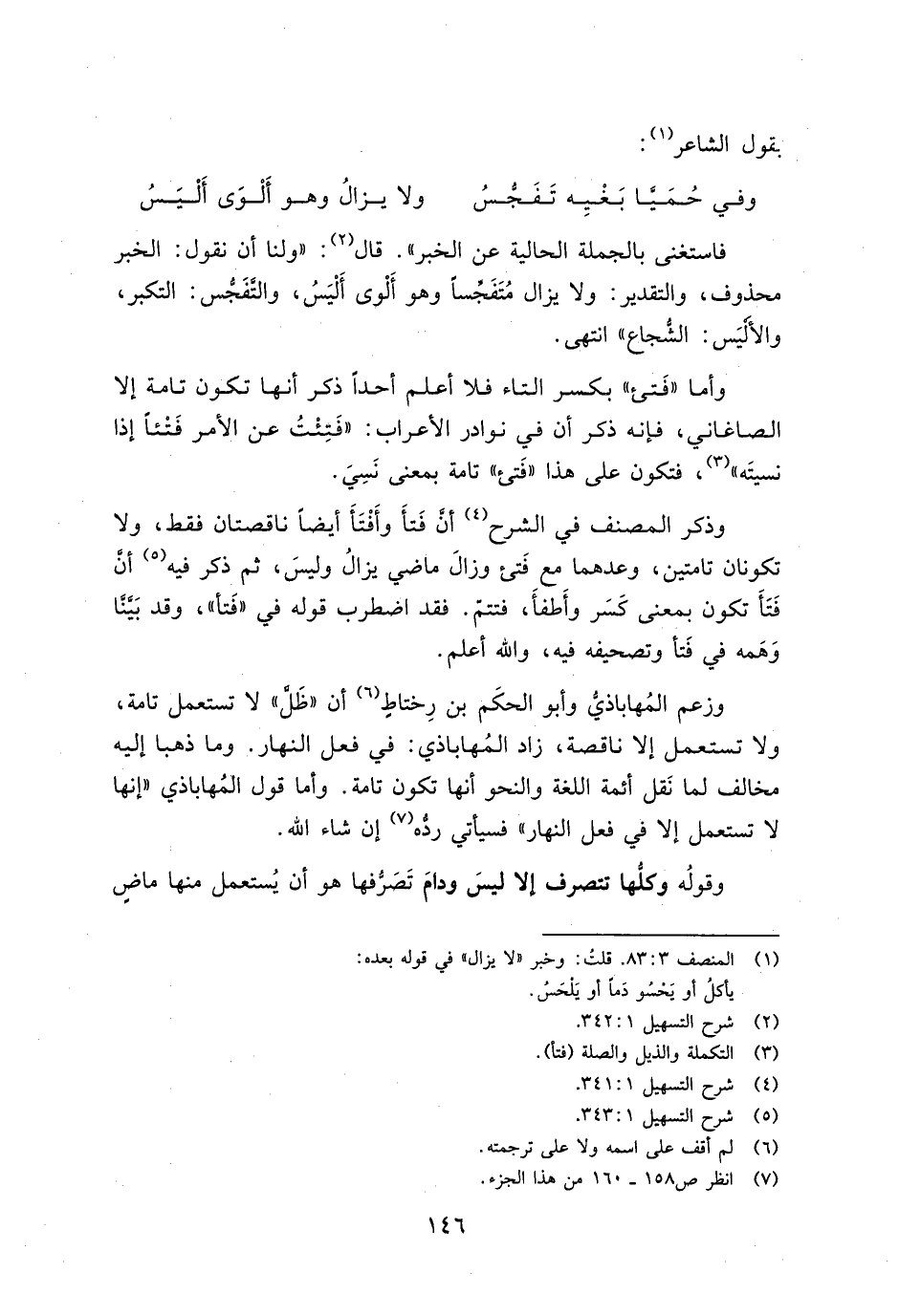 وذكر المصنف في الشرح أن فتأ وأفتأ أيضًا ناقصتان فقط، ولا تكونان تامتين، وعدهما مع فتئ وزال ماضي يزال وليس، ثم ذكر فيه أن فتأ تكون بمعنى كسر وأطفأ، فتتم. فقد اضطرب قوله في "فتأ"، وقد بينا وهمه في فتأ وتصحيفه فيه، والله أعلم.