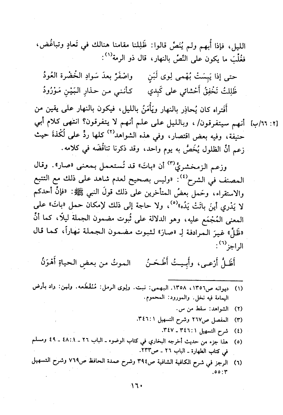 وزعم الزمخشري أن "بات" قد تستعمل بمعنى "صار". وقال المصنف في الشرح: "وليس بصحيح لعدم شاهد على ذلك مع التتبع والاستقراء، وحمل بعض المتأخرين على ذلك قول النبي صلي الله عليه وسلم: "فإن أحدكم لا يدري أين باتت يده"، ولا حاجة إلى ذلك لإمكان حمل "بات" على المعنى المجمع عليه، وهو الدلالة على ثبوت مضمون الجملة ليلًا، كما أن "ظل" غير المرادفة لـ"صار" لثبوت مضمون الجملة نهارًا، كما قال الراجز: