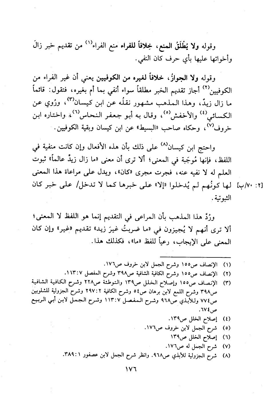 واحتج ابن كيسان على ذلك بأن هذه الأفعال وإن كانت منفية في اللفظ، فإنها مُوجبة في المعنى؛ ألا ترى أن معنى "ما زال زيد عالمًا" ثبوت العلم له لا نفيه عنه، فجرت مجرى "كان"، ويدل على مراعاة هذا المعنى لها كونهم لم يُدخلوا "إلا" على خبرها كما لا تدخل/ على خبر كان الثبوتية.