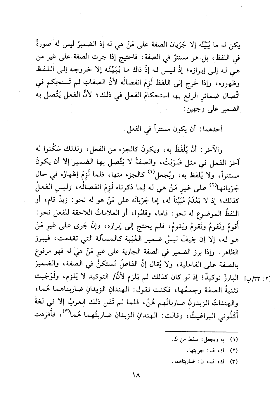 والآخر: أن يلفظ به، ويكون كالجزء من الفعل، ولذلك سكنوا له آخر الفعل في مثل ضربت، والصفة لا يتصل بها الضمير إلا أن يكون مستترًا، ولا يلفظ به، ويجعل كالجزء منها، فلما لزم إظهاره في حال جريانها على غير من هي له لما ذكرناه لزم انفصاله، وليس الفعل كذلك؛ إذ لا يعدم مبينًا له، إما جريانه على من هو له نحو: زيد قام، أو اللفظ الموضوع له نحو: قاما، وقاموا، أو العلامات اللاحقة للفعل نحو: أقوم ونقوم وتقوم ويقوم، فلم يحتج إلى إبرازه، وإن جرى على غيره من هو له، إلا إن خفيف لبس ضمير الغيبة كالمسألة التي تقدمت، فيبرز الظاهر. وإذا برز الضمير في الصفة الجارية على غير من هي له فهو مرفوع بالصفة على الفاعلية، ولا يقال إن الفاعل مستكن في الصفة، والضمير البارز توكيد؛ إذ لو كان كذلك لم يلزم لأن/ التوكيد لا يلزم، ولوجبت تثنية الصفة وجمعها، فكنت تقول: الهندان الزيدان ضاربتاهما هما، والهندات الزيدون ضارباتهم هن، فلما لم تقل ذلك العرب إلا في لغة أكلوني البراغبث، وقالت: الهندان الزيدان ضاربتهما هما، فأفردت