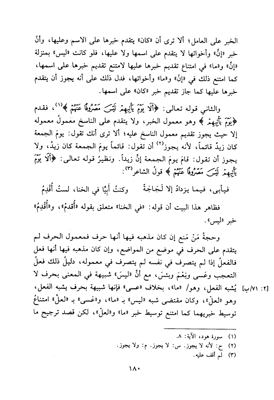 والثاني قوله تعالى: {أَلاَ يَوْمَ يَاتِيهِمْ لَيْسَ مَصْرُوفاً عَنْهُمْ}، فقدم {يَوْمَ يَاتِيهِمْ} وهو معمول الخبر، ولا يتقدم على الناسخ معمول معموله إلا حيث يجوز تقديم معمول الناسخ عليه؛ ألا ترى أنك تقول: يوم الجمعة كان زيد قائمًا، لأنه يجوز أن تقول: قائمًا يوم الجمعة كان زيد، ولا يجوز أن تقول: قام يوم الجمعة إن زيدًا. ونظير قوله تعالى: {أَلاَ يَوْمَ يَاتِيهِمْ لَيْسَ مَصْرُوفاً عَنْهُمْ}، قول الشاعر: