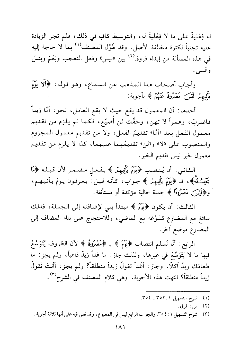 الرابع: أنا نُسلم انتصاب {يَوْمَ} بـ {مَصْرُوفاً} لأن الظروف يُتوسع فيها ما لا يُتوسع في غيرها، ولذلك جاز: ما غدًا زيد ذاهبًا، ولم يجز: ما طعامك زيد آكلًا، وجاز: أغدًا تقول زيدًا منطلقًا؟ ولم يجز: أأنت تقول زيدًا منطلقًا؟ انتهت هذه الأجوبة، وهي كلام المصنف في الشرح.