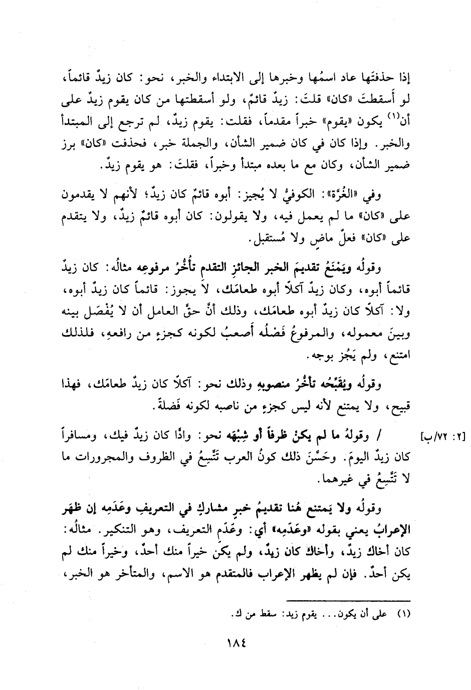 وفي "الغرة": الكوفي لا يُجيز: أبوه قائم كان زيد؛ لأنهم لا يقدمون على "كان" ما لم يعمل فيه، ولا يقولون: كان أبوه قائم زيد، ولا يتقدم على "كان" فعل ماض ولا مُستقبل.