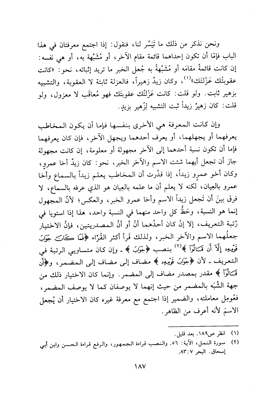 وإن كانت المعرفة هي الأخرى بنفسها فإما أن يكون المخاطب يعرفهما أو يجهلهما، أو يعرف أحدهما ويجهل الآخر، فإن كان يعرفها فإما أن تكون نسبة أحدهما إلى الآخر مجهولة أو معلومة، إن كانت مجهولة جاز أن تجعل أيهما شئت الاسم والآخر الخبر، نحو: كان زيد أخا عمرو، وكان أخو عمرو زيدًا، إذا قدرت أن المخاطب يعلم زيدًا بالسماع وأخا عمرو بالعيان، لكنه لا يعلم أن ما علمه بالعيان هو الذي عرفه بالسماع، لا فرق بين أن تجعل زيدًا الاسم وأخا عمرو الخبر، والعكس؛ لأن المجهول إنما هو النسبة، وحظ كل واحد منهما في النسبة واحد، هذا إذا استويا في رُتبة التعريف، إلا إن كان أحدُهما أنْ أو أنَّ المصدريتين، فإن الاختيار جعلهما الاسم والآخر الخبر، ولذلك قرأ أكثر القراء {فَمَا كَانَ جَوَابَ قَوْمِهِ إِلاَّ أَن قَالُوا} بنصب {جَوَابَ} - وإن كان متساويي الرتبة في التعريف - لأن {جَوَابَ قَوْمِهِ} مضاف إلى مضاف إلى المضمر، و {أَن قَالُوا} مقدر بمصدر مضاف إلى المضمر. وإنما كان الاختيار ذلك من جهة الشبه بالمضمر من حيث إنهما لا يوصفان كما لا يوصف المضمر، فعومل معاملته، والضمير إذا اجتمع مع معرفة غيره كان الاختيار أن يُجعل الاسم لأنه أعرف من الظاهر.