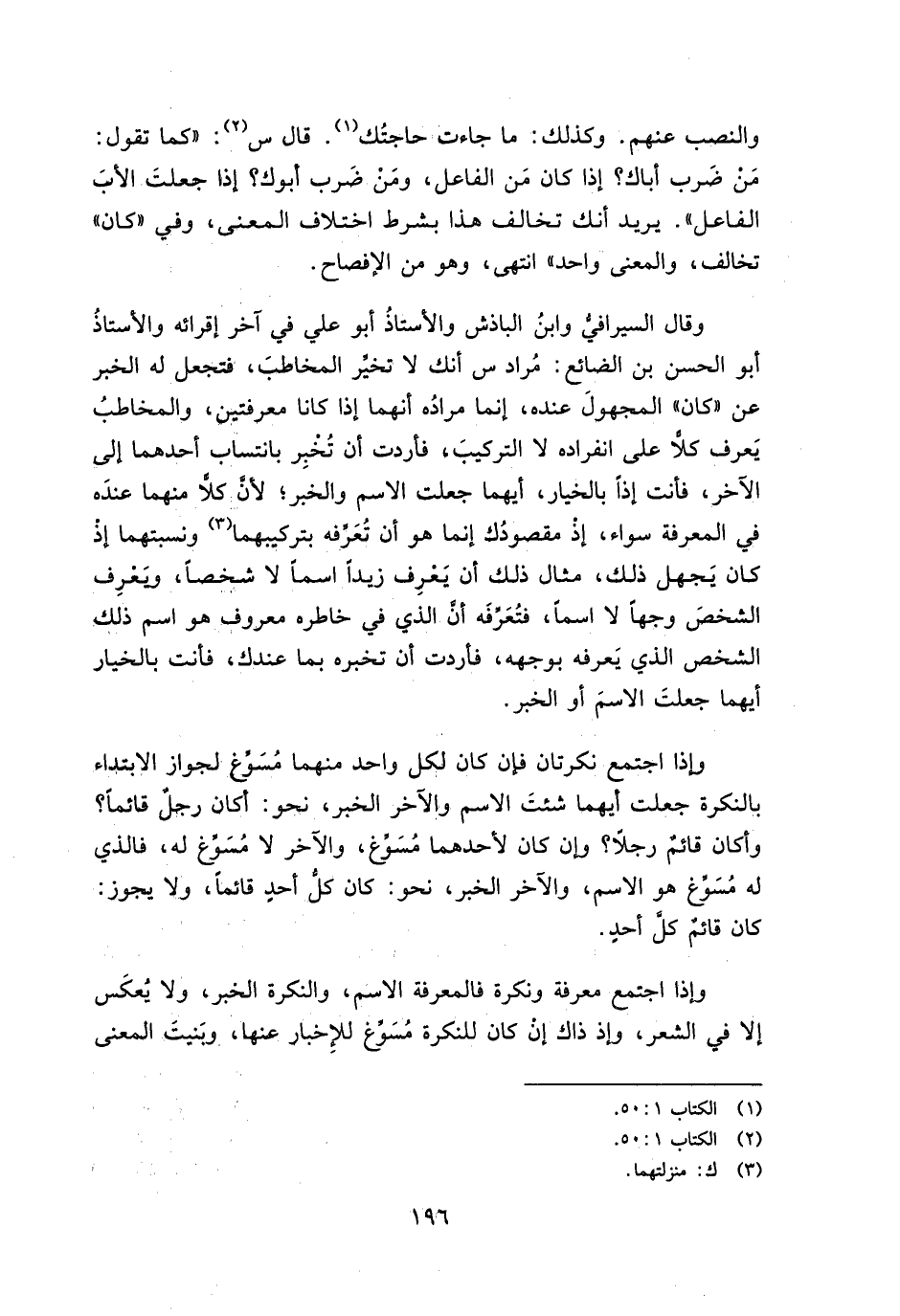 وقال السيرافي وابن الباذش والأستاذ أبو علي في آخر إقرائه والأستاذ أبو الحسن بن الضائع: مُراد س أنك لا تخير المخاطب، فتجعل له الخبر عن "كان" المجهول عنده، إنما مراده أنهما إذا كانا معرفتين، والمخاطب يعرف كلًا على انفراده لا التركيب، فأردت أن تُخبر بانتساب أحدهما إلى الآخر، فأنت إذًا بالخيار، أيهما جعلت الاسم والخبر؛ لأن كلًا منهما عنده في المعرفة سواء، إذ مقصودك إنما هو أن تُعرفه بتركيبهما ونسبتهما إذ كان يجهل ذلك، مثال ذلك أن يعرف زيدًا اسمًا لا شخصًا، ويعرف الشخص وجهًا لا اسمًا، فتُعرفه أن الذي في خاطره معروف هو اسم ذلك الشخص الذي يعرفه بوجهه، فأردت أن تخبره بما عندك، فأنت بالخيار أيهما جعلت الاسم أو الخبر.