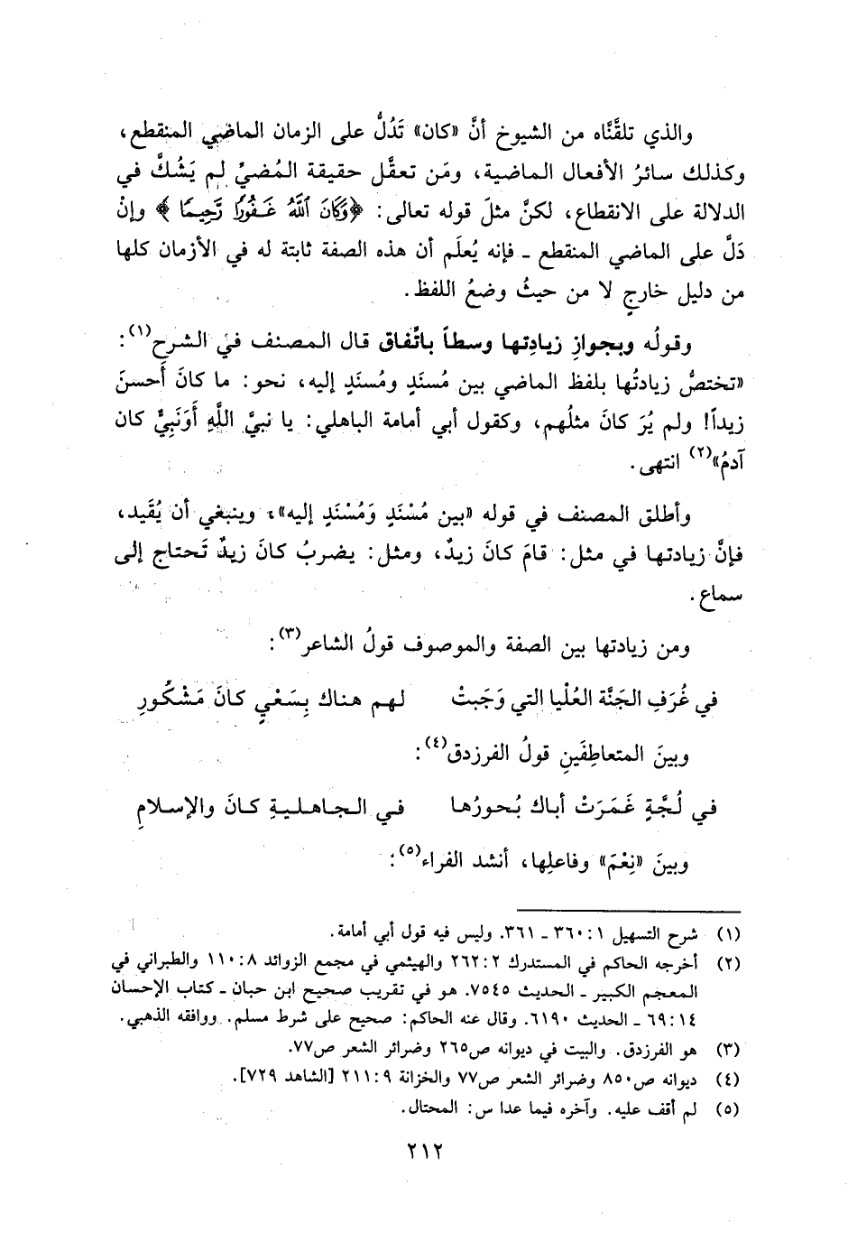 وقوله وبجواز زيادتها وسطًا باتفاق قال المصنف في الشرح: "تختص زيادتها بلفظ الماضي بين مسند ومسند إليه, نحو: ما كان أحسن زيدًا ولم ير كان مثلهم, وكقول أبي أمامة الباهلي: يا نبي الله أو نبي كان آدم" انتهى.