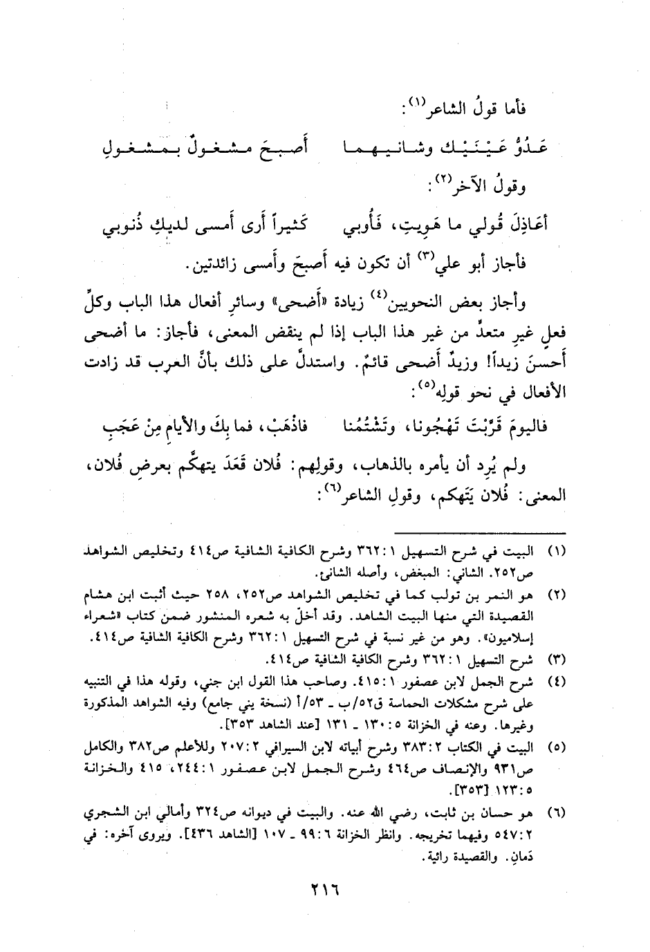 وأجاز بعض النحويين زيادة "أضحى" وسائر أفعال هذا الباب وكل فعل غير متعد من غير هذا الباب إذا لم ينقض المعنى, فأجاز: ما أضحى أحسن زيدًا وزيد أضحى قائم, واستدل على ذلك بأن العرب قد زادت الأفعال في نحو قوله: