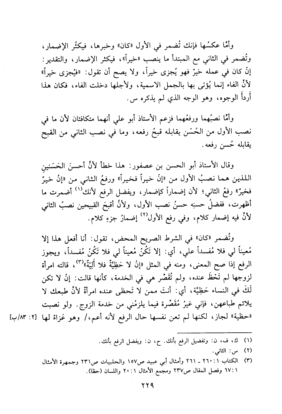 وتضمر "كان" في الشرط الصريح المحض، تقول: أنا أفعل هذا إلا معينا لي فلا مفسدا علي، أي: إلا تكن معينا لي فلا تكن مفسدا، ويجوز الرفع إذا صح المعني، ومنه في المثل "إن لا حظية فلا ألية"، قالته امرأة لزوجها لم تحظ عنده، ولم تقصر هي في الخدمة، كأنها قالت: إن لا تكن لك في النساء حظية، أي: أنت ممن لا تحظي عنده امرأة لأن طبعك لا يلائم طباعهن، فإني غير مقصرة فيما يلزمني من خدمة الزوج. ولو نصبت "حظية" لجاز، لكنها لم تعن نفسها حال الرفع لأنه أعم،/ وهو عزاءٌ لها
