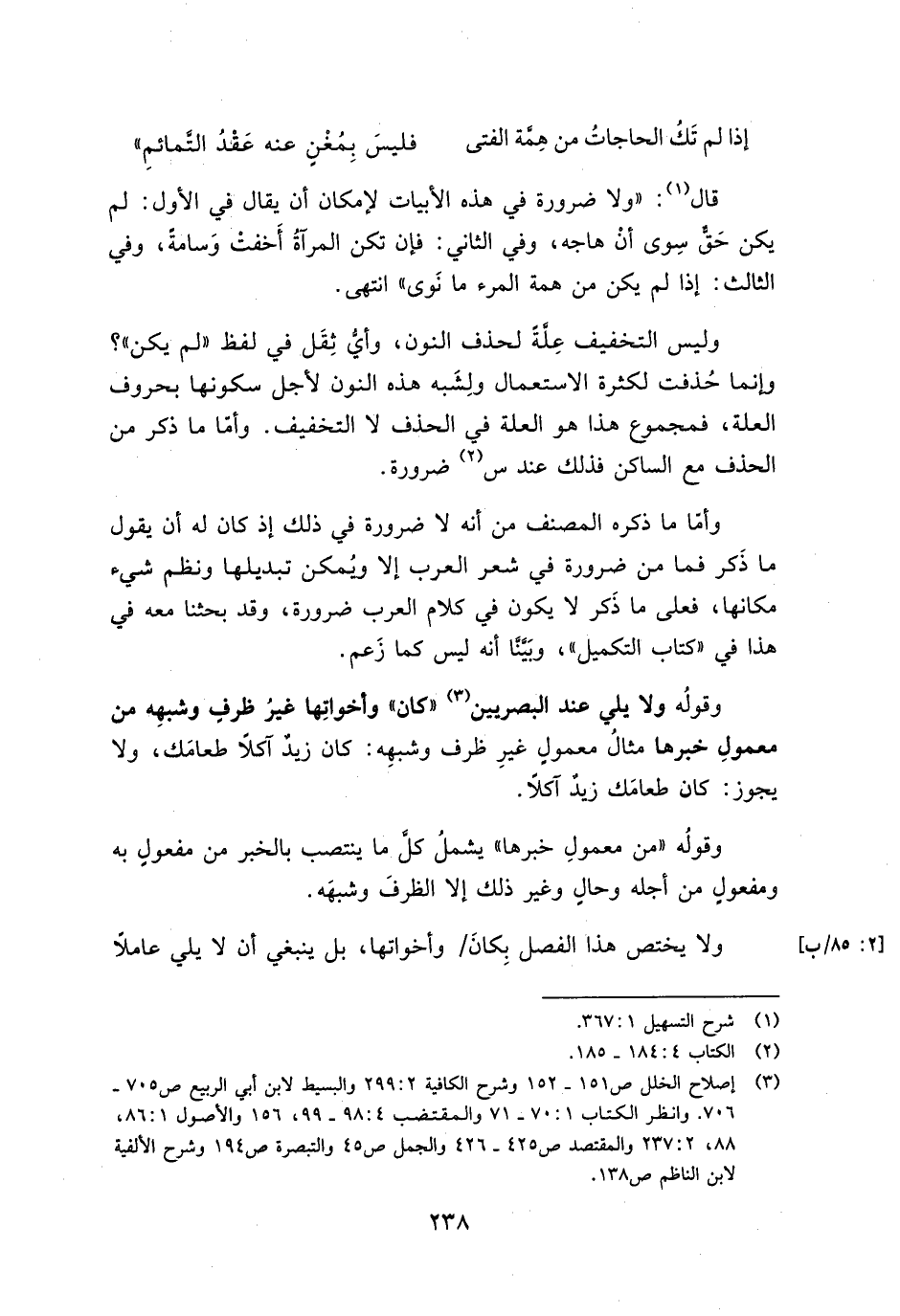 وليس التخفيف علة لحذف النون, وأي ثقل في لفظ "لم يكن"؟ وإنما حذفت لكثرة الاستعمال ولشبه هذه النون لأجل سكونها بحروف العلة, فمجموع هذا هو العلة في الحذف لا التخفيف. وأما ما ذكر من الحذف مع الساكن فذلك عن س ضرورة.