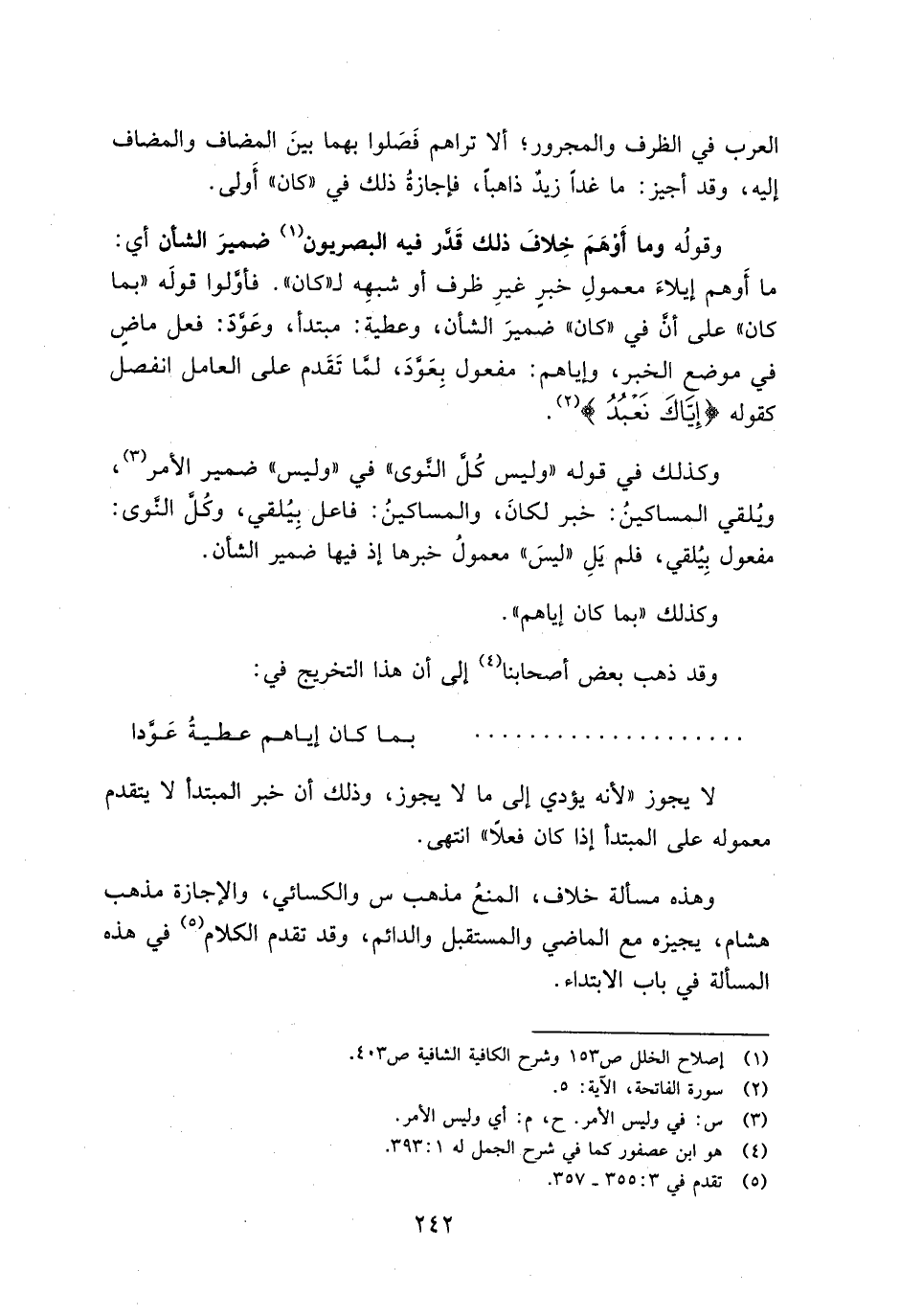 وقولَ وما أَوْهَمَ خِلافَ ذلك قدَّر فيه البصريون ضميرَ الشأن أي: ما أَوهم إيلاءَ معمولِ خبرٍ غيرِ ظرف أو شبهه لـ (كان). فأوَّلوا قوله (بما كان) على أنَّ في (كان) ضميرَ الشأن، وعطية: مبتدأ، وعَوَّدَ: فعل ماضٍ في موضع الخبر، وإياهم: مفعول بعَوَّدَ، لمَّا تقدم على العامل انفصل كقوله {إِيَّاكَ نَعْبُدُ}.