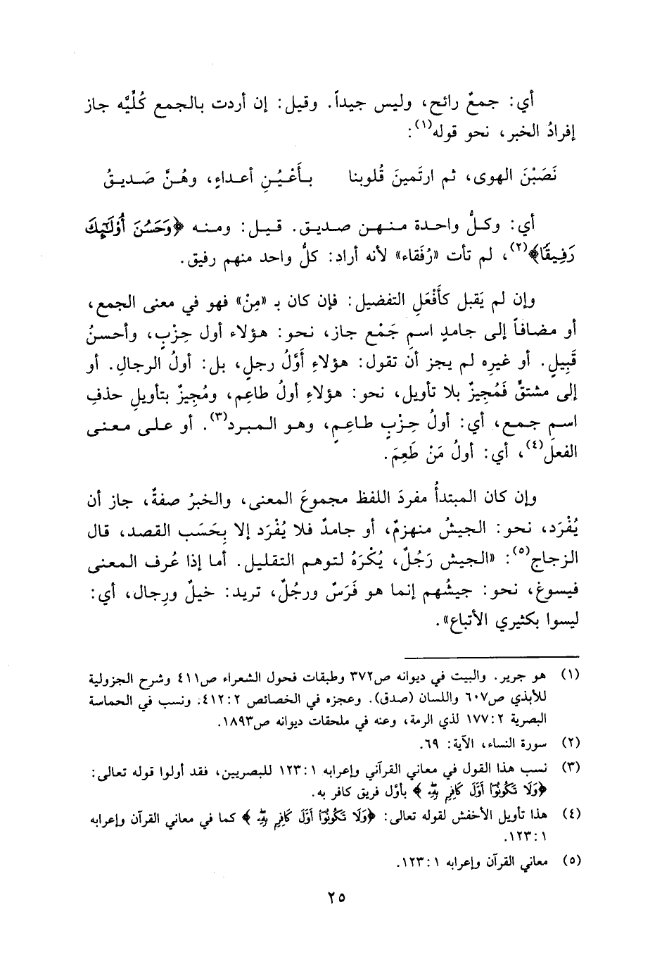 وإن كان المبتدأ مفرد اللفظ مجموع المعنى، والخبر صفة، جاز أن يفرد، نحو: الجيش منهزم، أو جامد فلا يفرد إلا بحسب القصد، قال الزجاج: "الجيش رجل، يكره لتوهم التقليل. أما إذا عرف المعنى فيسوغ، نحو: جيشهم إنما هو فرس ورجل، تريد: خيل ورجال، أي: ليسوا بكثيري الأتباع".