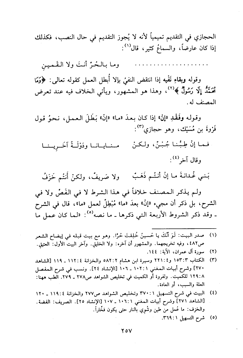 ولم يذكر المصنف خلافًا في هذا الشرط لا في الفص ولا في الشرح، بل ذكر أن مجيء "إن" بعد "ما" مبطل لعمل "ما"، قال في الشرح -وقد ذكر الشروط الأربعة التي ذكرها- ما نصه: "لما كان عمل ما
