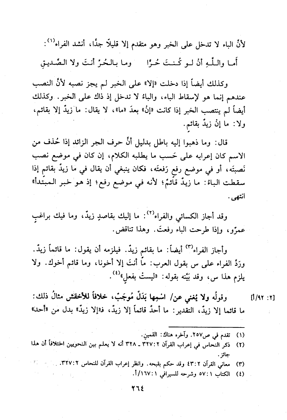 وأجاز الفراء أيضًا: ما بقائم زيد. فيلزمه أن يقول: ما قائمًا زيد. ورد الفراء على س بقول العرب: ما أنت إلا أخونا، وما قائم أخوك. ولا يلزم هذا س، وقد بينه بقوله: "ليست بفعل".