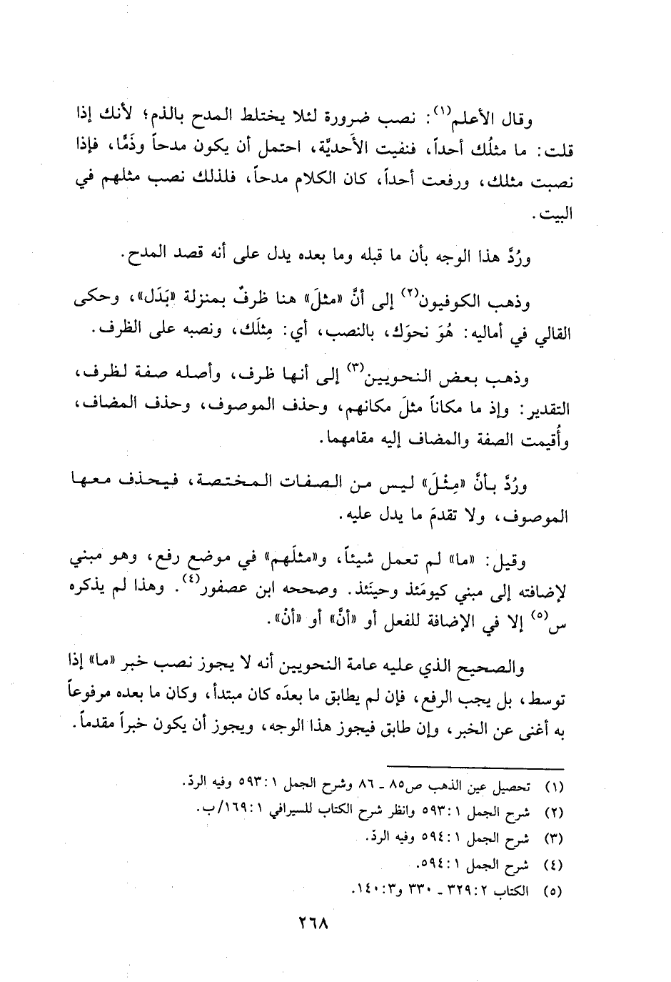 وقال الأعلم: نصب ضرورة لئلا يختلط المد بالذم؛ لأنك إذا قلت: ما مثلك أحدًا، فنفيت الأحدية، احتمل أن يكون مدحًا وذمًا، فإذا نصبت مثلك، ورفعت أحدًا، كان الكلام مدحًا، فلذلك نصب مثلهم في البيت.