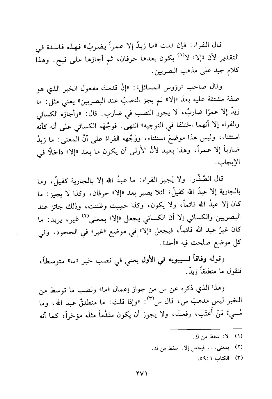 قال الصفار: ولا يجيز الفراء: ما عبد الله إلا بالجارية كفيل، وما بالجارية إلا عبد الله كفيل؛ لئلا يصير بعد "إلا" حرفان، وكذا لا يجيز: ما كان إلا عبد الله قائمًا، ولا يكون، كذا حسبت وظننت، وذلك جائز عند البصريين والكسائي إلا أن الكسائي يجعل "إلا" بمعنى غير، يريد: ما كان غير عبد الله قائمًا، فيجعل "إلا" في موضع "غير" في الجحود، وفي كل موضع صلحت فيه "أحد".