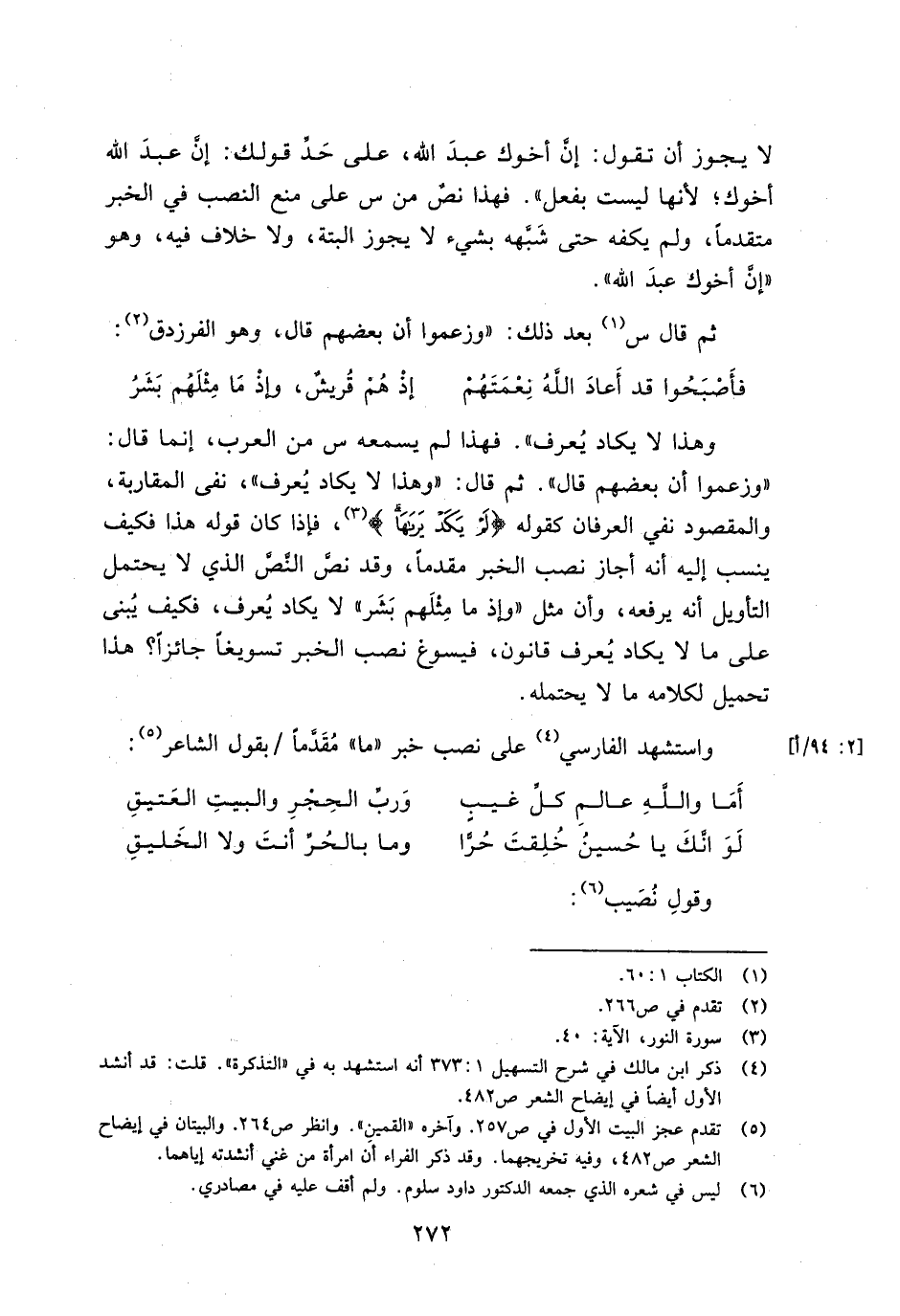 وهذا لا يكاد يعرف". فهذا لم يسمعه س من العرب، وإنما قال: "وزعموا أن بعضهم قال". ثم قال: "وهذا لا يكاد يعرف"، نفى المقاربة، والمقصود نفي العرفات كقوله {لَمْ يَكَدْ يَرَاهَا}، فإذا كان قوله هذا فكيف ينسب إليه أنه أجاز نصب الخبر مقدمًا، وقد نص النص الذي لا يحتمل التأويل أنه يرفعه، وأن مثل "وإذ ما مثلهم بشر" لا يكاد يعرف، فكيف يبنى على ما لا يكاد يعرف قانون، فيسوغ نصب الخبر تسويغًا جائزًا؟ هذا تحميل لكلامه ما لا يحتمله.