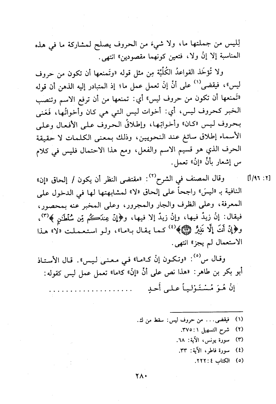 ولا تؤخذ القواعد الكلية من مثل قوله "وتمنعها أن تكون من حروف ليس"، فيقضى على أن إن تعمل عمل ما؛ إذ المتبادر إليه الذهن أن قوله "تمنعها أن تكون من حروف ليس" أي: تمنعها من أن ترفع الاسم وتنصب الخبر كخروف ليس، أي: أخوات ليس التي هي كان وأخواتها، فعني بجروف ليس "كان" وأخواته، وإطلاق الحروف على الأفعال وعلى الأسماء إطلاق سائغ عند النحويين، وذلك بمعنى الكلمات لا حقيقة الحرف الذي هو قسيم الاسم والفعل، ومع هذا الاحتمال فليس في كلام س إشعار بأن "إن" تعمل.