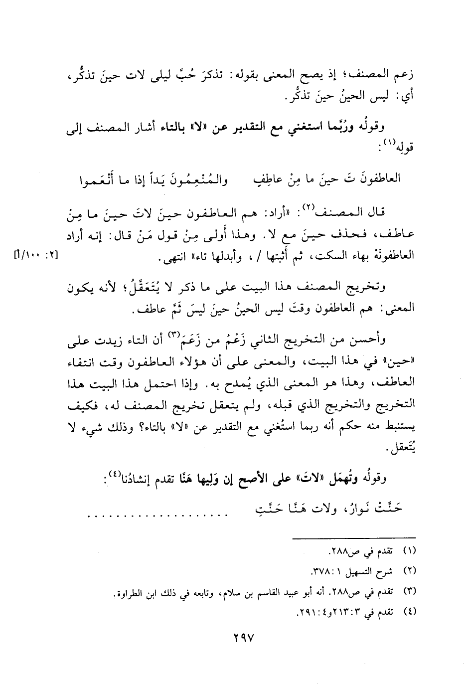 وأحسن من التخريج الثاني زعم من زعم أن التاء زيدت على "حين" في هذا البيت, والمعنى على أن هؤلاء العاطفون وقت انتفاء العاطف, وهذا هو المعنى الذي يمدح به. وإذا احتمل هذا البيت هذا التخريج والتخريج الذي قبله, ولم يتعقل تخريج المصنف له, فكيف يستنبط منه حكم أنه ربما استغني مع التقدير عن "لا" بالتاء؟ وذلك شيء لا يتعقل.