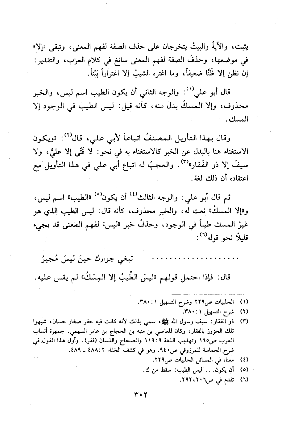 ثم قال أبو علي: والوجه الثالث أن يكون "الطيب" اسم ليس, و"إلا المسك" نعت له, والخبر محذوف كأنه قال: ليس الطيب الذي هو غير المسك طيباً في الوجود, وحذف خبر "ليس" لفهم المعنى قد يجيء قليلاً نحو قوله: