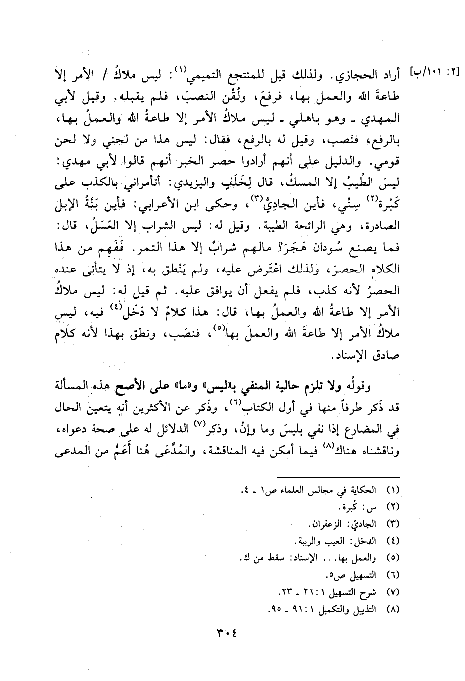 أراد الحجازي. ولذلك قيل للمنتجع التميمي: ليس ملاك/ الأمر إلا طاعة الله والعمل بها, فرفع, ولقن النصب, فلم يقبله. وقيل لأبي المهدي- وهو بأهلي- ليس ملاك الأمر إلا طاعة الله والعمل بها, بالرفع, فنصب, وقيل له بالرفع, فقال: ليس هذا من لحني ولا لحن قومي. والدليل على أنهم أرادوا حصر الخبر أنهم قالوا لأبي مهدي: ليس الطيب إلا المسك, قال لخلف واليزيدي: أتأمراني بالكذب على كبرة سني فأين الجادي, وحكي ابن الأعرابي: فأين بنة الإبل الصادرة, وهي الرائحة الطيبة. وقيل له: ليس الشراب إلا العسل, قال: فما يصنع سودان هجر؟ مالهم شراب إلا هذا التمر. ففهم من هذا الكلام الحصر, ولذلك اعترض عليه, ولم ينطق به, إذ لا يتأتى عنده الحصر لأنه كذب, فلم يفعل أن يوافق عليه. ثم قيل له: ليس ملاك الأمر إلا طاعة الله والعمل بها, قال: هذا كلام لا دخل فيه, ليس ملاك الأمر إلا طاعة الله والعمل بها, فنصب ونطق بهذا لأنه كلام صادق الإسناد.