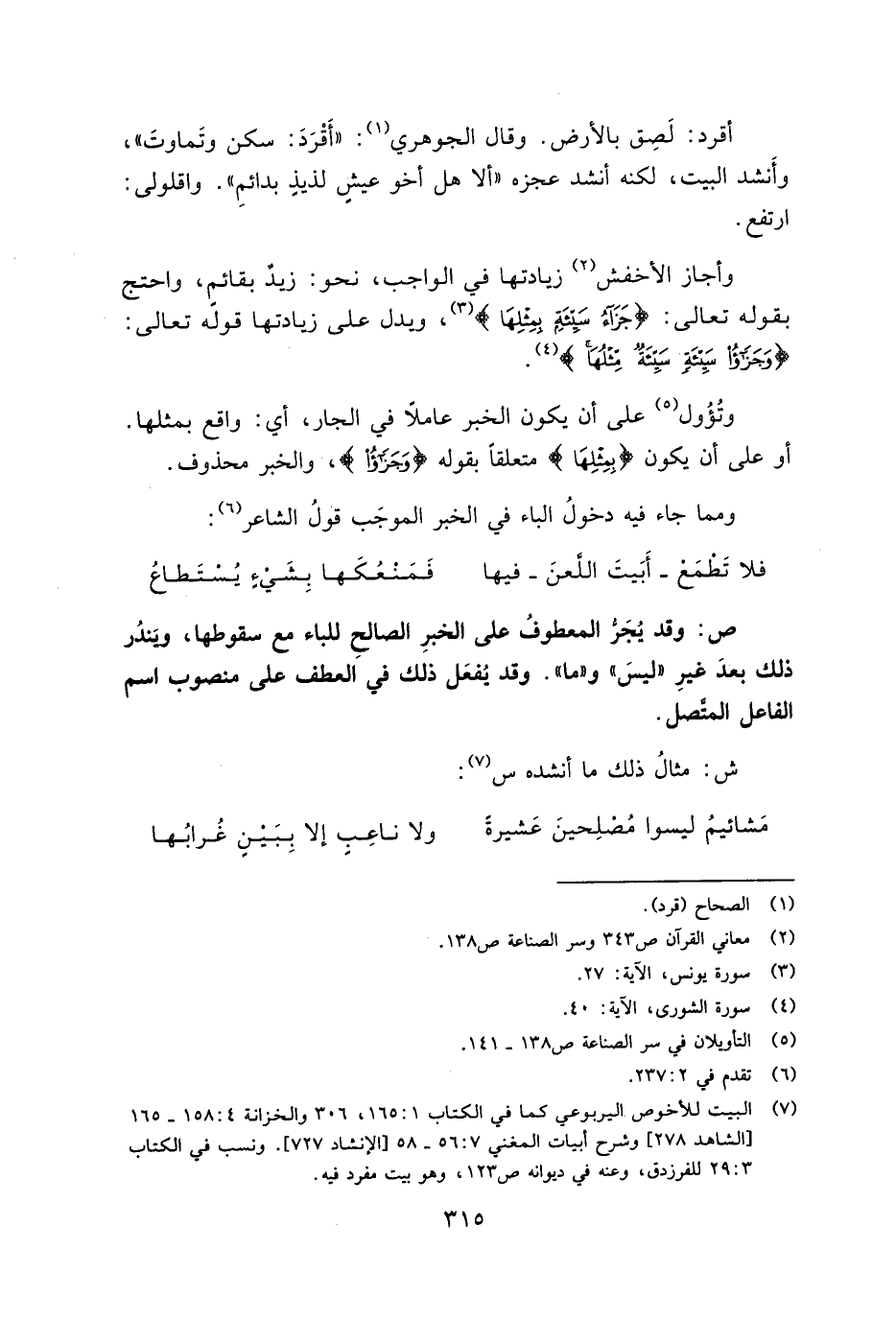 وأجاز الأخفش زيادتها في الواجب، نحو: زيد بقائم، واحتج بقوله تعالى: {جَزَاءُ سَيِّئَةٍ بِمِثْلِهَا}، ويدل على زيادتها قوله تعالى. {وَجَزَاءُ سَيِّئَةٍ سَيِّئَةٌ مِّثْلُهَا}