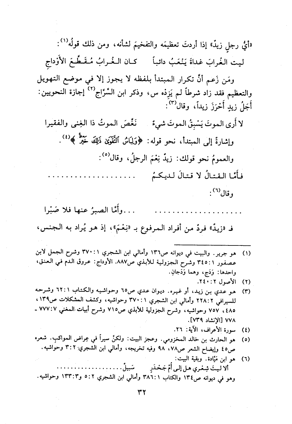 من زعم أن تكرار المبتدأ بلفظه لا يجوز إلا في موضع التهويل والتعظيم فقد زاد شرطًا لم يزده س، وذكر ابن السراج إجازة النحويين: أجل زيد أحرز زيدًا، وقال: