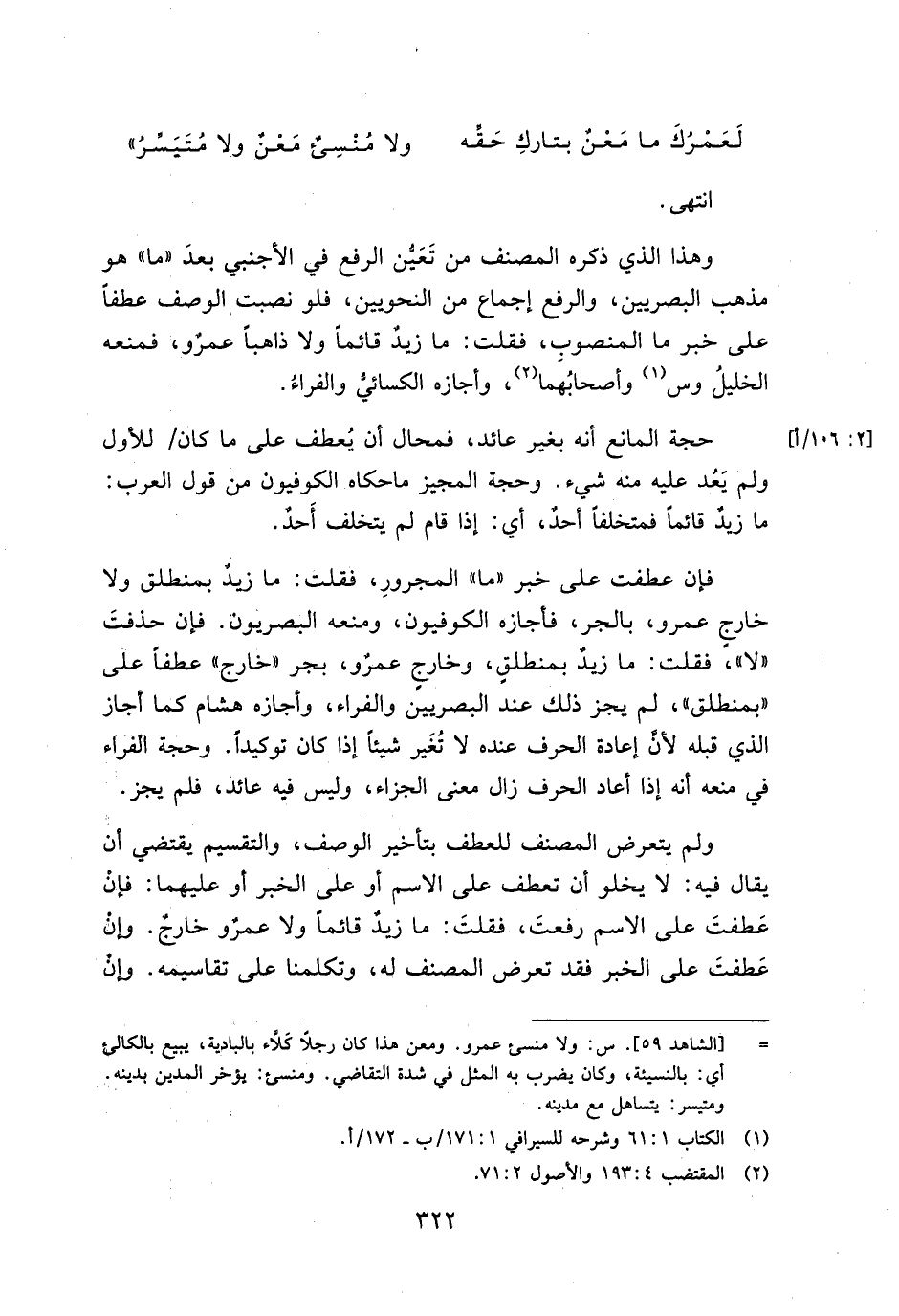 فإن عطفت على خبر "ما" المجرور، فقلت: ما زيد بمنطلق ولا خارج عمرو، بالجر، فأجازه الكوفيون، ومنعه البصريون. فإن حذفت "لا"، فقلت: ما زيد بمنطلق، وخارج عمرو، بجر "خارج" عطفًا على "بمنطلق"، لم يجز ذلك عند البصريين والفراء، وأجازه هشام كما أجاز الذي قبله لأن إعادة الحرف عنده لا تغير شيئًا إذا كان توكيدًا. وحجة الفراء في منعه أنه إذا أعاد الحرف زال معنى الجزاء، وليس فيه عائد، فلم يجز.